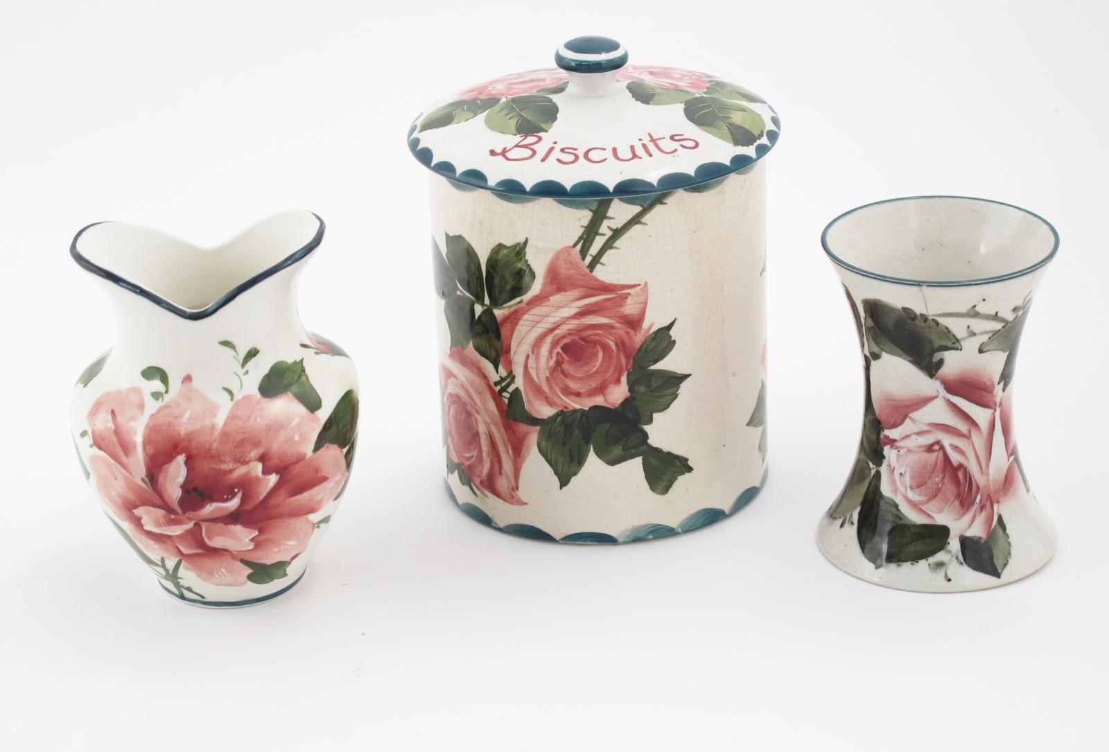 A Wemyss Cabbage Rose biscuit box and cover, cylindrical form, painted in pink and green, the cover inscribed Biscuits, a Wemyss vase in the same pattern and another similar main unmarked, second vase impressed marks, hairlines 16.5cm. high