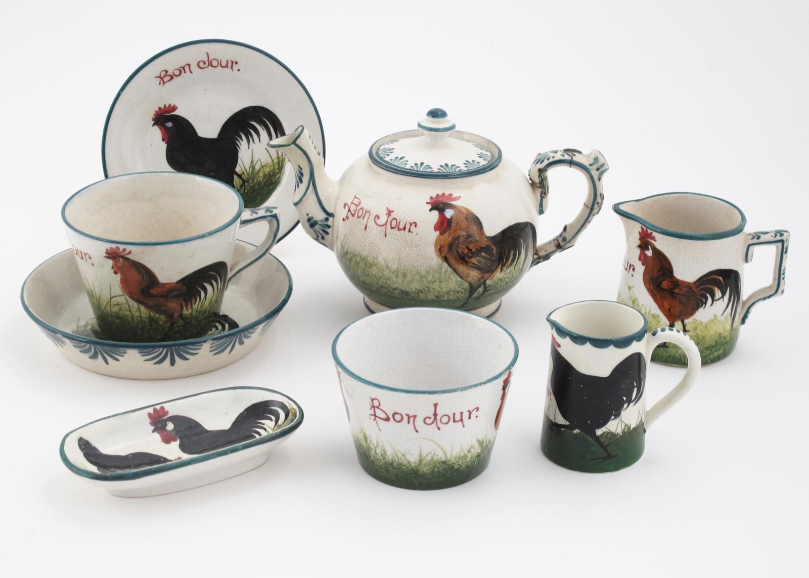 A Wemyss Cockerel pattern teapot and cover, milk-jug and matched sugar basin, painted in colours, and five other Cockerel pattern pieces various marks, damages teapot 11cm. high