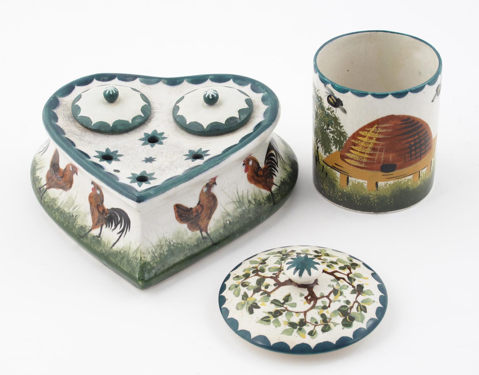 A Wemyss heart-shaped double inkwell, painted with a chickens and cockerel design in colours, a Wemyss Beehive pattern preserve pot, and a covered painted with foliage impressed mark, restored 16cm. wide