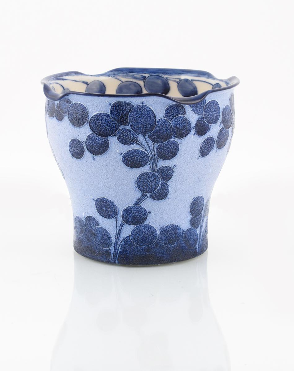 'Honesty' a James Macintyre Florian Ware jardiniere designed by William Moorcroft, swollen cylindrical form with fluted rim, painted in shades of blue printed factory mark, painted green signature 18.5cm. high