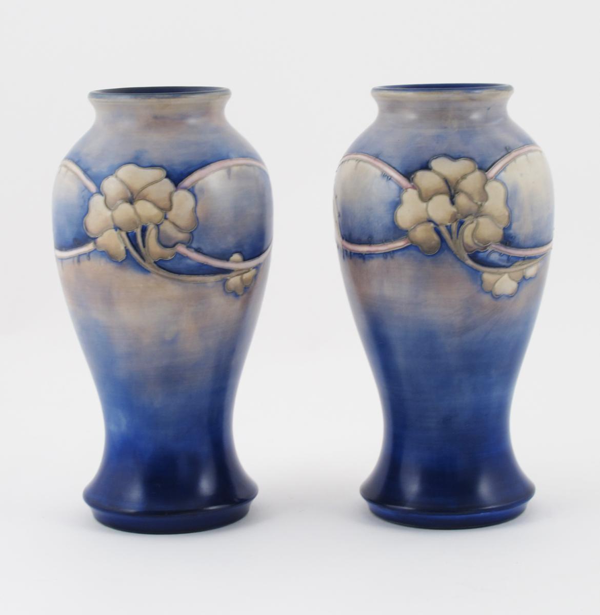 'Rose, Thistle and Shamrock' a pair of Moorcroft Pottery salt-glaze vases, baluster form, painted in shades of pink and green on a streaked green and blue ground impressed marks, painted blue signature restoration to one 22.5cm. high