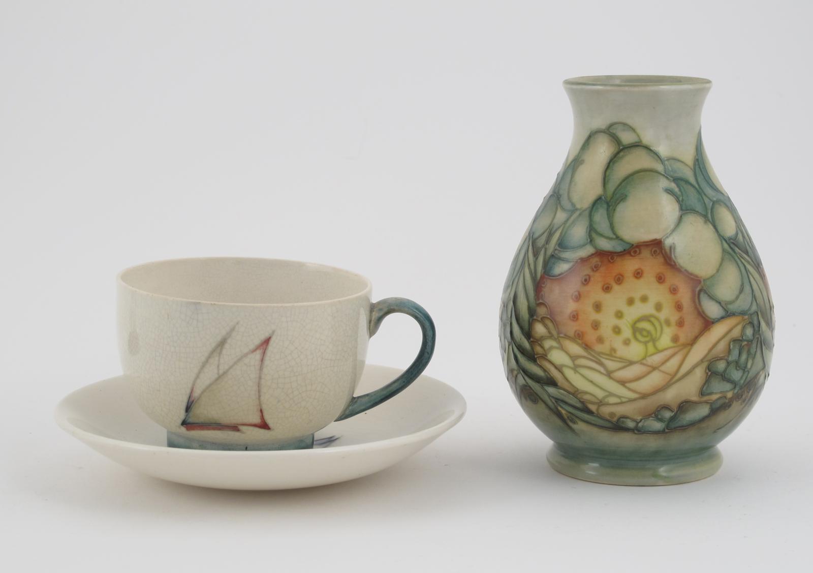 'Yacht' a Moorcroft Pottery cup and saucer designed by William Moorcroft, painted in blue and red on an ivory ground and a 'Summer Seasons' a Moorcroft Pottery vase designed by Sally Tuffin, impressed marks, Moorcroft Museum label, hairline to top rim of cup, saucer 14cm. diam.