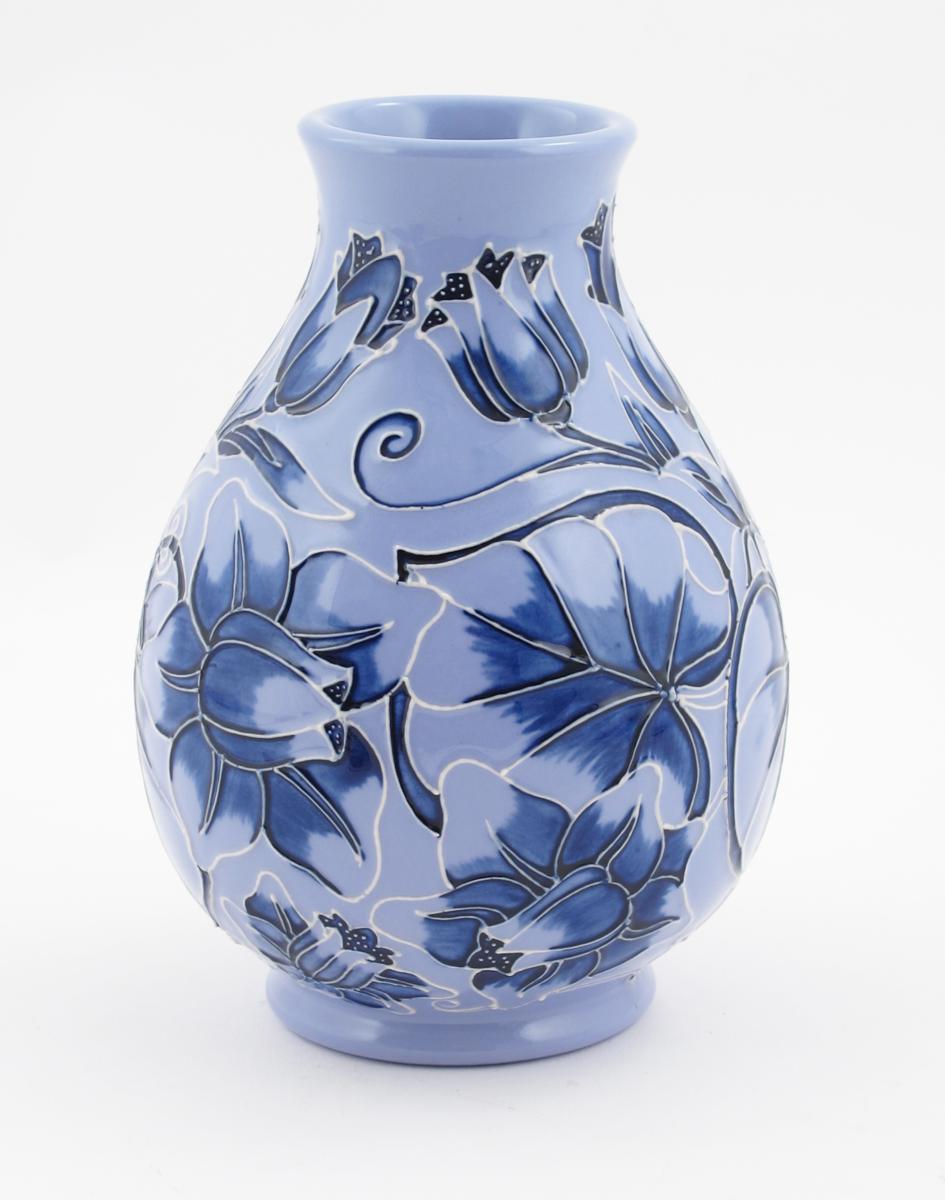 A modern Moorcroft vase, dated 2000, tubeline decorated with flowers and foliage in blue on a pale blue ground impressed and painted marks, 19cm. high