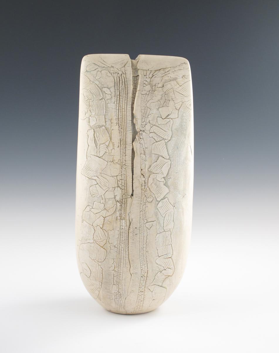 a tall Raku vase, textured split surface, glazed matt white incised marks, dated 1989, exhibition number 53cm. high