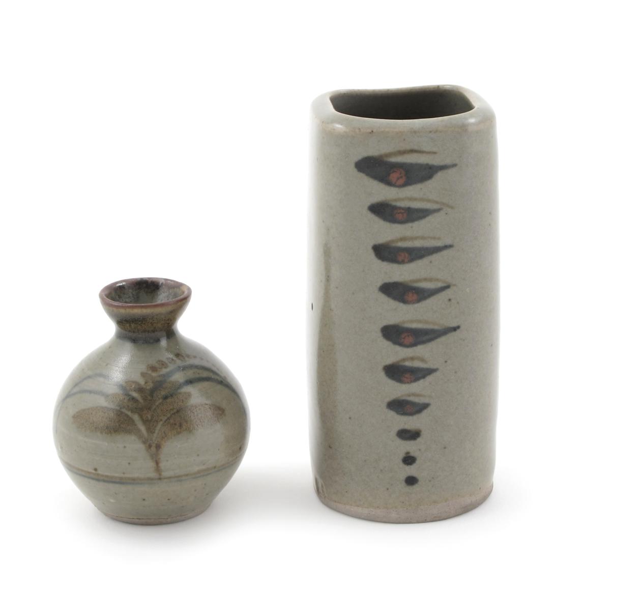 a stoneware vase, square section painted with an abstracted ear of corn design, and another Lowerdown Pottery vase impressed seal marks 12.5cm. high