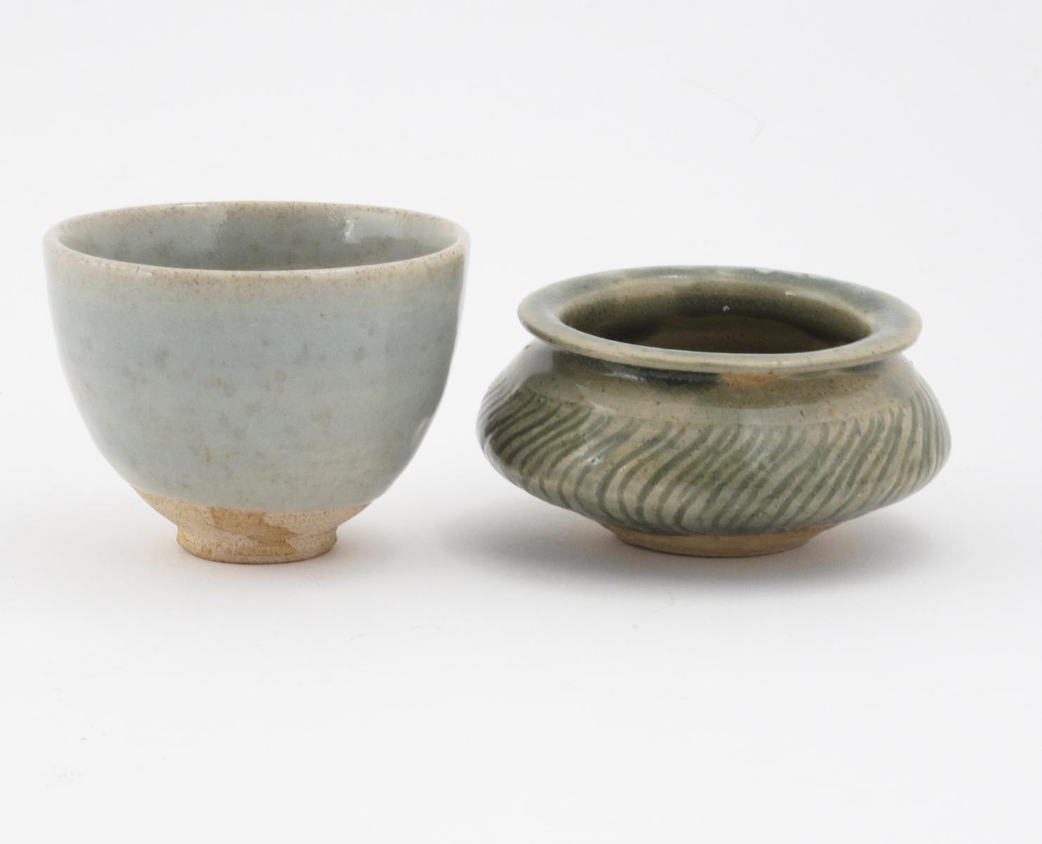 a compressed stoneware vase, with everted rim and incised decoration, covered to the foot with a celadon glaze, and another Katherine Pleydell-Bouverie vase impressed seal mark, 2nd vase with hairline crack 10.5cm. wide