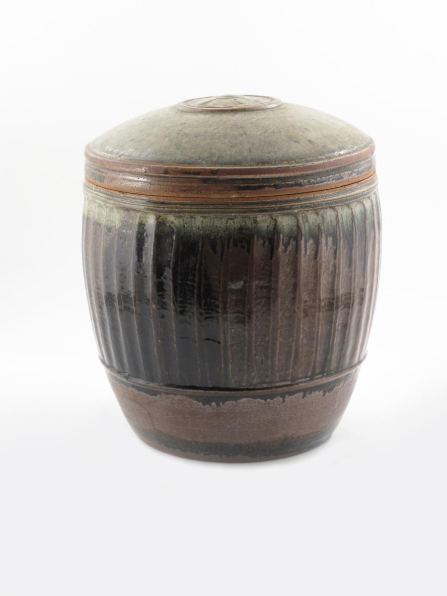 a massive stoneware storage jar and cover, the fluted body covered in a tenmoku and ash glaze, the slightly domed cover with an ash glaze unsigned 43cm. high