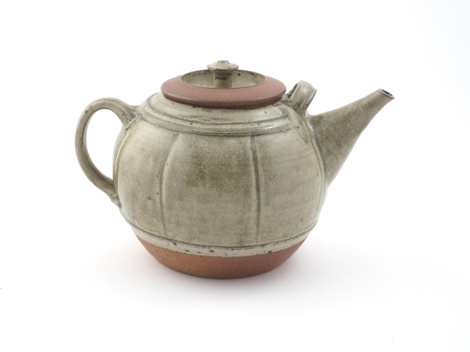 a large ovoid stoneware teapot and cover, incised with vertical flutes, covered to the foot in an ash glaze unsigned 20cm. high