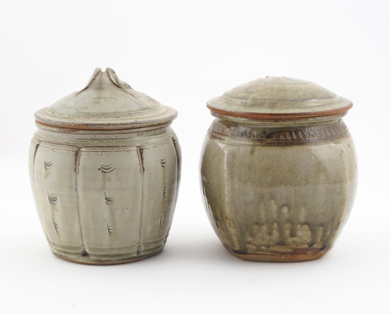 a stoneware storage jar and cover, with incised column decoration, covered in an ash glaze, and a Richard Batterham storage jar and cover impressed seal mark flooded to Dodd 22cm. high