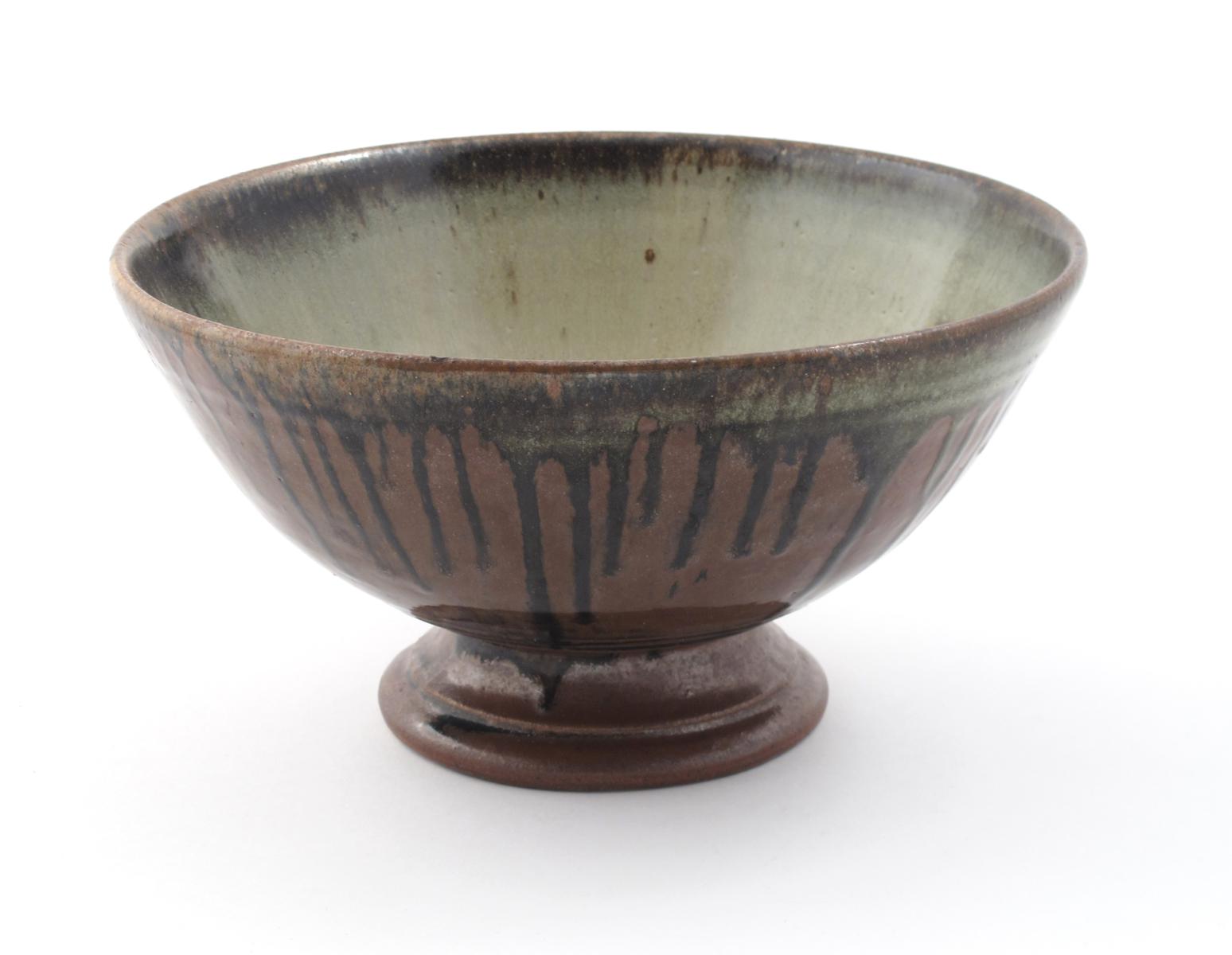 Richard Batterham (born 1936) an unusual pedestal bowl, the exterior covered in a running brown glaze, the interior ash green unsigned 28.5cm. diam.