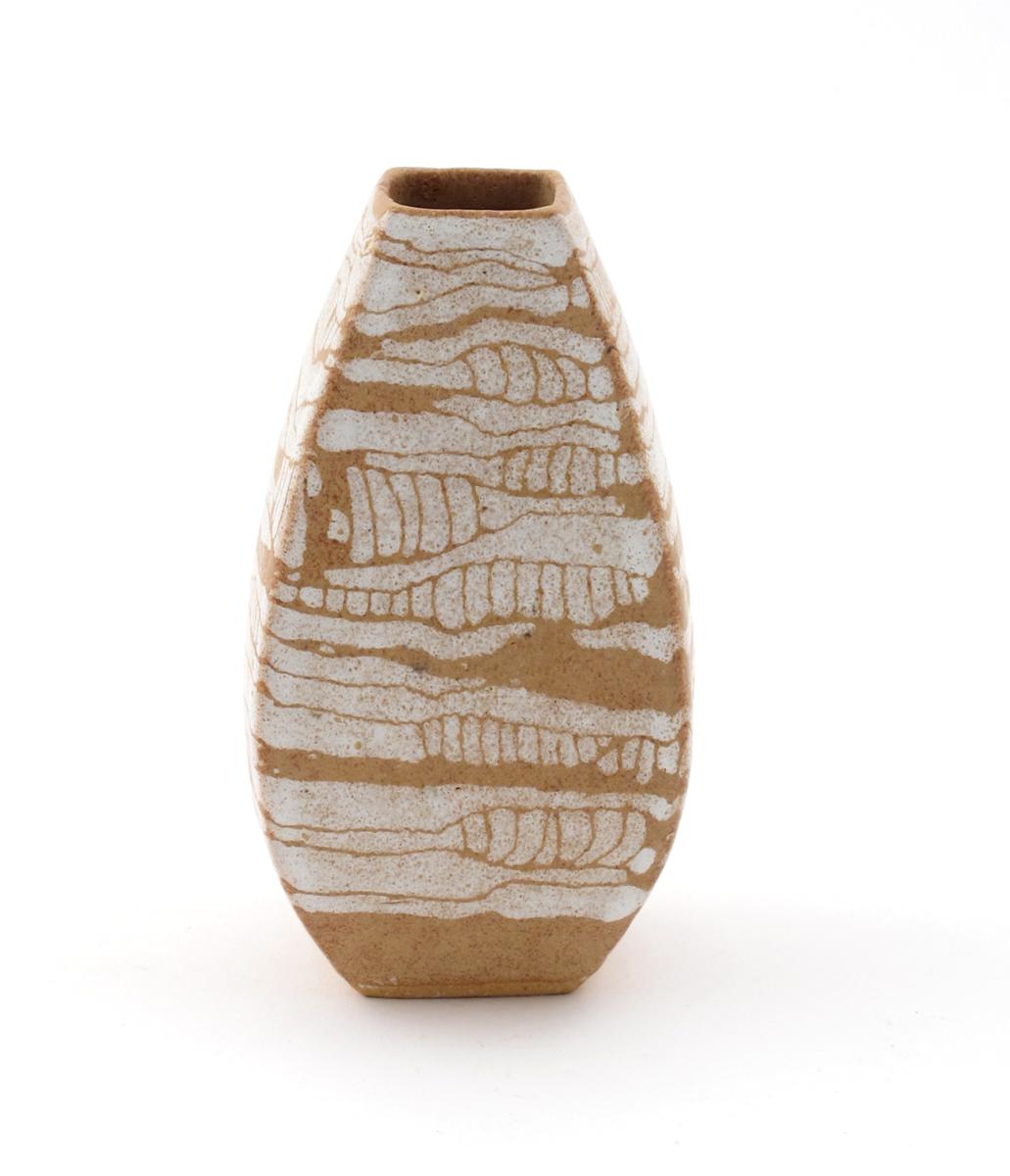 Carolyn Genders (born 1957) a stoneware swollen vase, square section, resist decorated with strata design incised Carolyn Genders 14cm. high