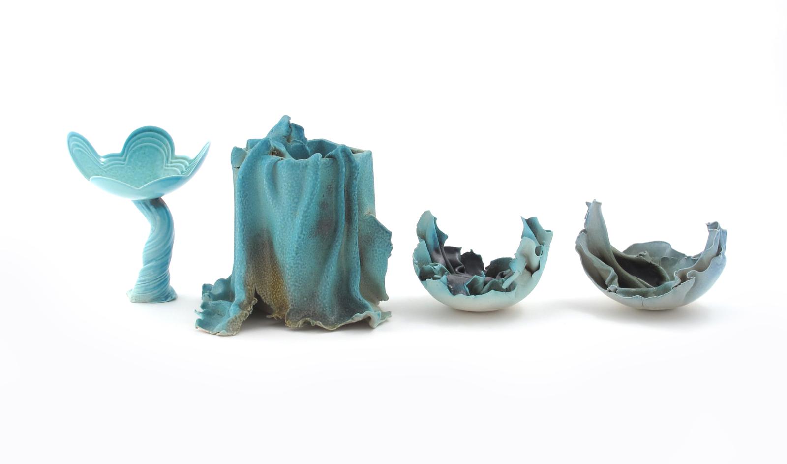 Ann Delphine Brown a porcelain flower stem form, glazed pale blue, a box form and two split vase forms, unsigned stem cup 15cm. high