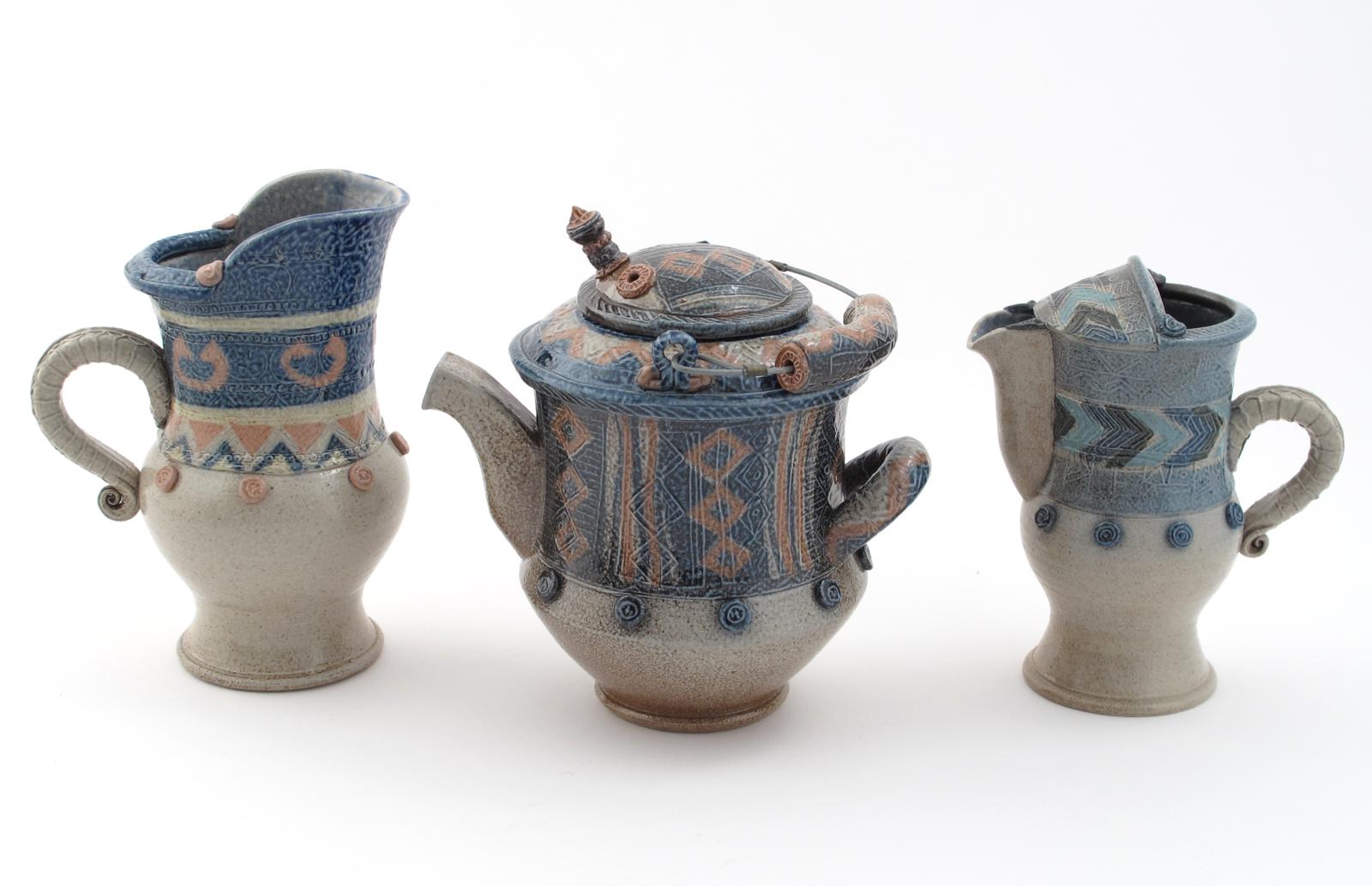 Carole Scott a salt-glaze stoneware teapot and cover, with applied decoration, and two jugs similar impressed seal marks, 18cm. high