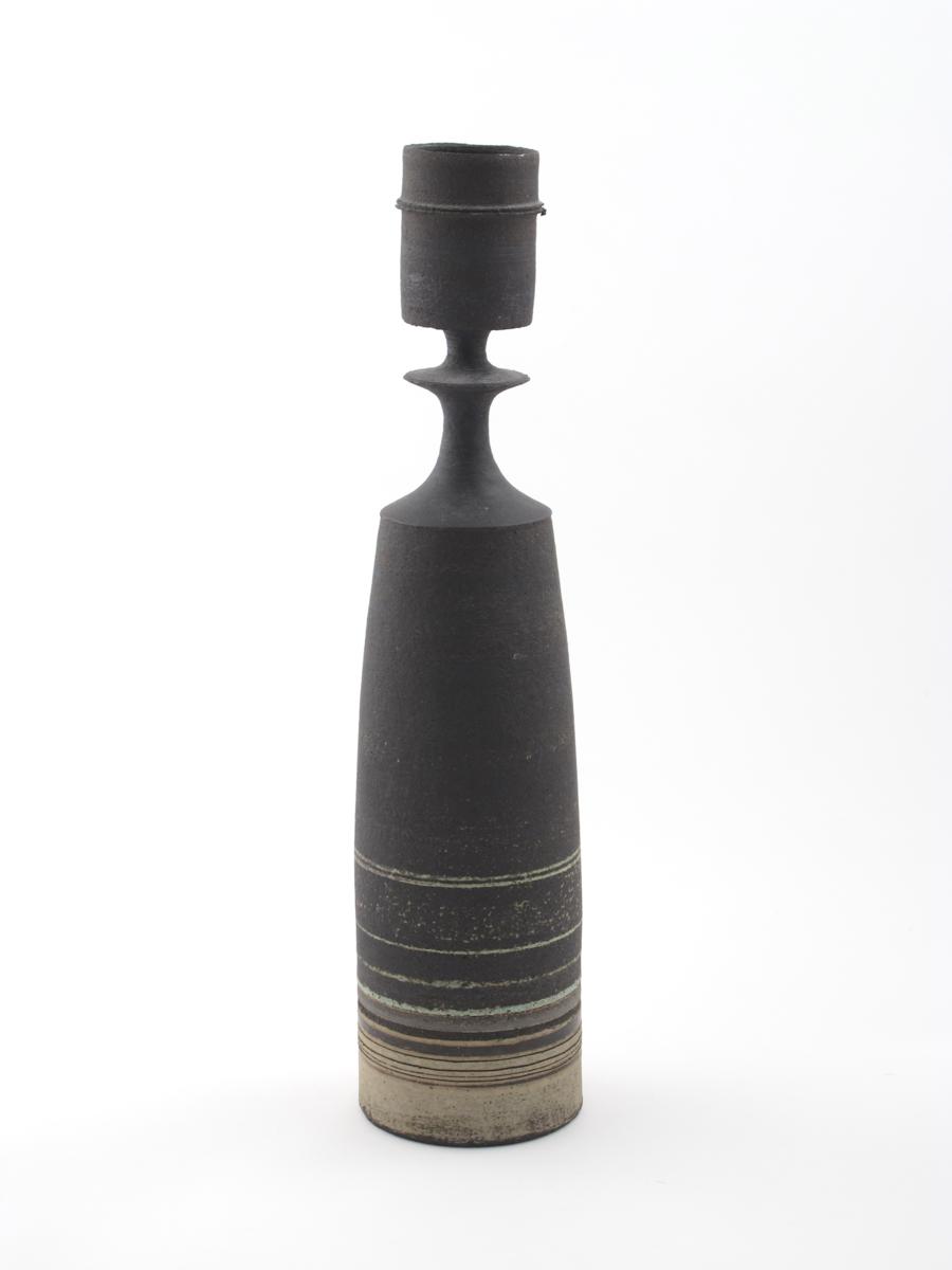a tall waisted cylindrical vase form, with incised bands to the base, covered in matt black and ochre glazes incised Hugo 51cm. high