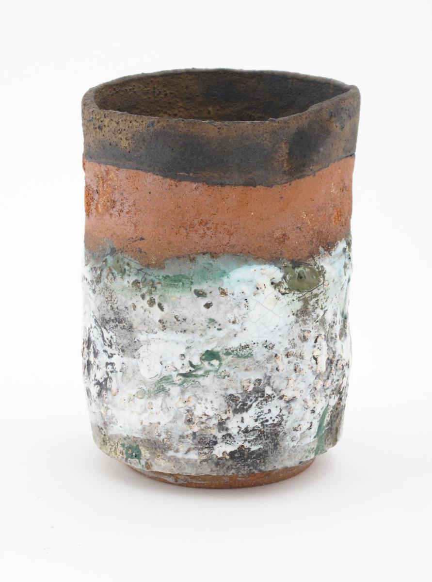 Robin Welch (born 1936) a stoneware cylindrical vase. painted with bronze and rust bands above a...