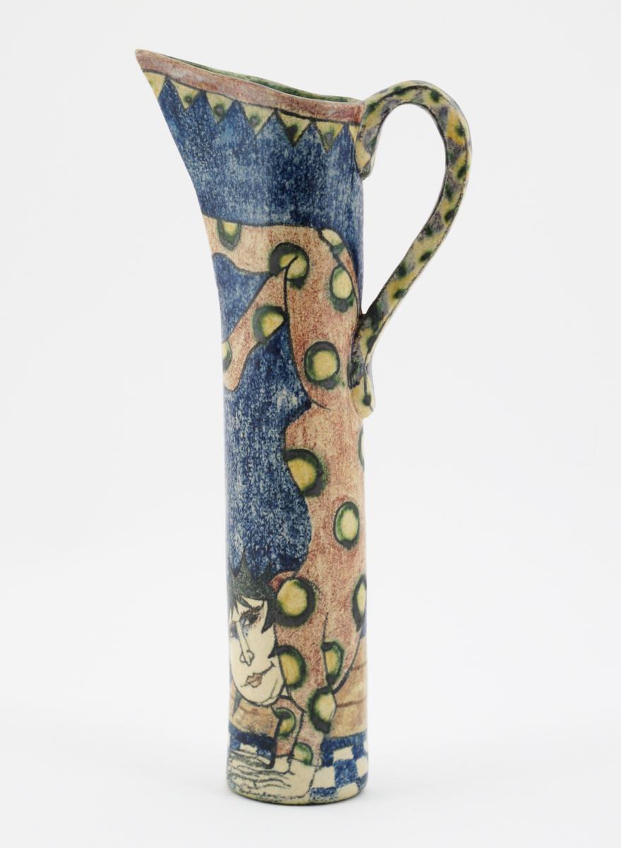 'I Will Give Thanks..' a slender pottery ewer, 2005, painted with an acrobat performing a handstand, the reverse incised with a verse, in colours painted signature and date to neck, 30cm. high