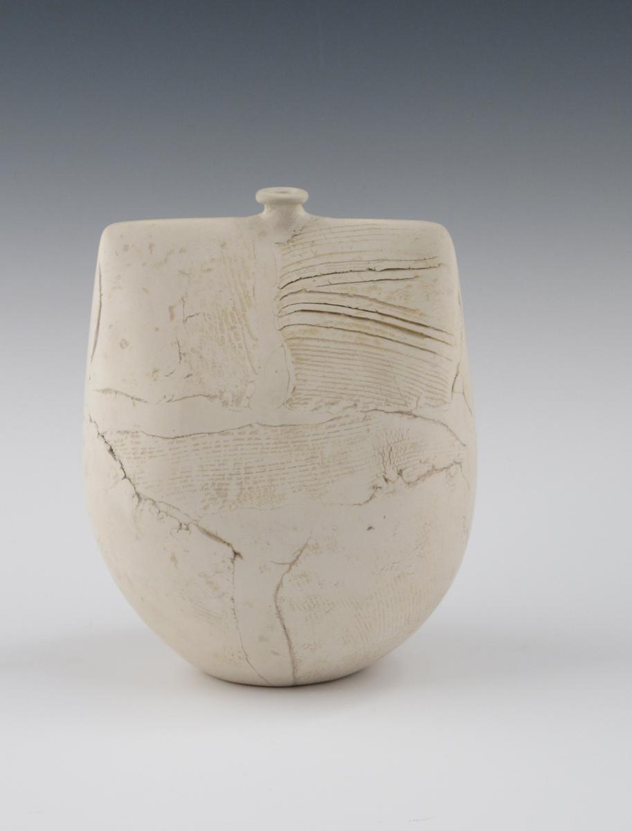 Peter Hayes (born 1946) a raku sack form vase, dated 1988, covered in a textured white glaze incised marks and date, impressed seal mark, 22cm. high