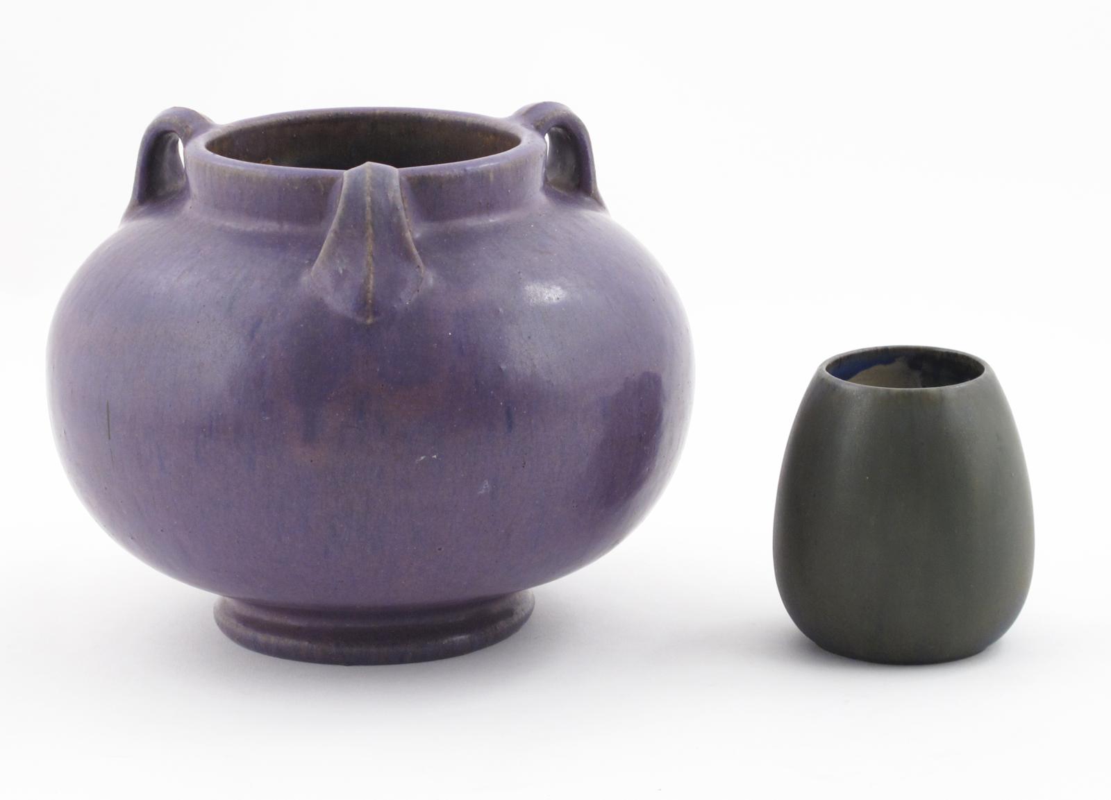 A Fulper Pottery vase, ovoid with three looped handles to shoulder, covered in a streaked purple glaze, and another small Fulper Pottery vase, impressed marks, small glaze fault to foot rim, 16.5cm. high