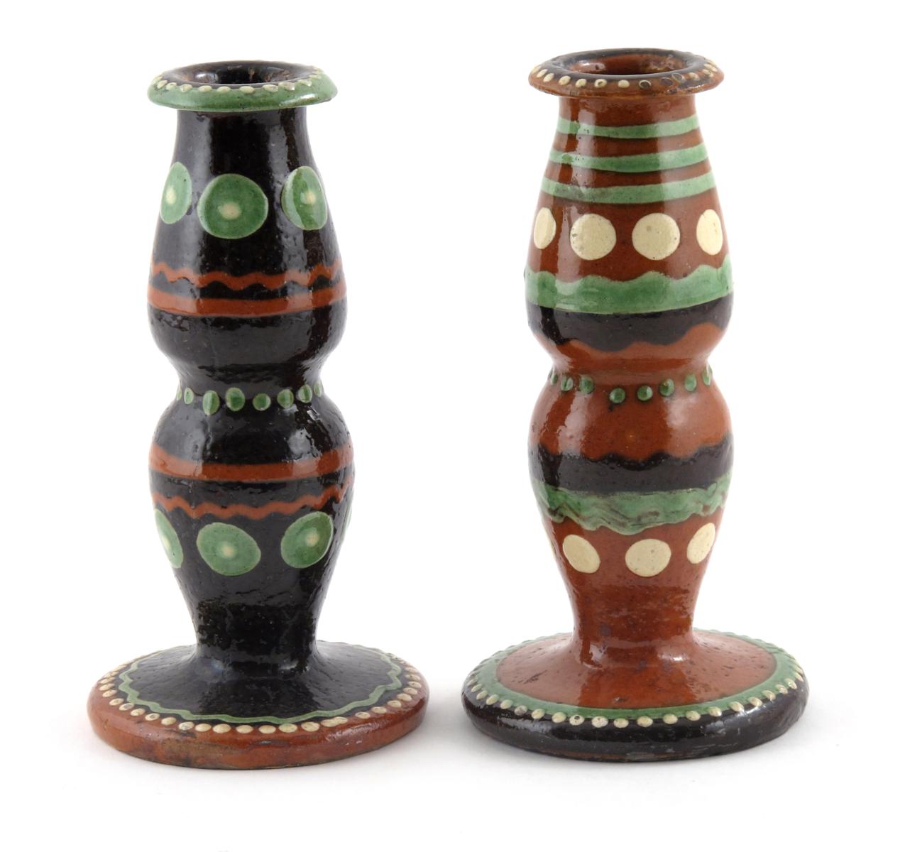 A near pair of Primavera earthenware candlesticks, waisted form, painted with dot and line motif, in green, cream and brown impressed Primavera mark, minor glaze loss and professional restoration, 19cm. high