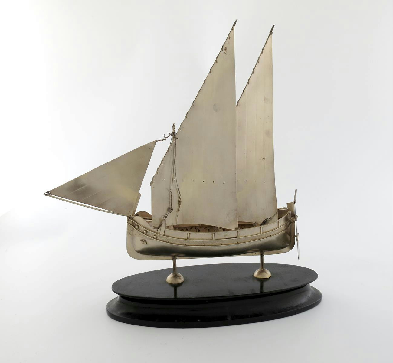 twin sails, on a raised ebonised oval plinth, height 35cm.