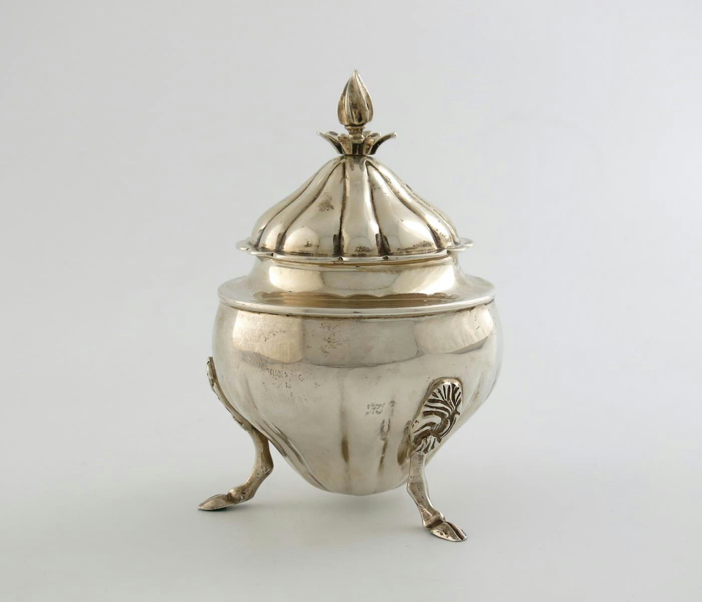 circular form, the pull-off cover with a fluted finial, on three hoof feet, height 14cm, approx. weight 7.1oz.