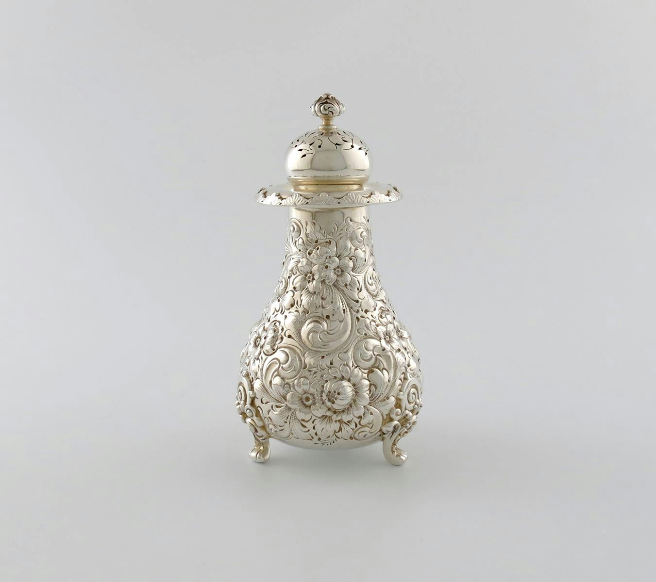 baluster form, foliate scroll decoration, on three scroll feet, height 16.5cm, approx. weight 8.5oz.