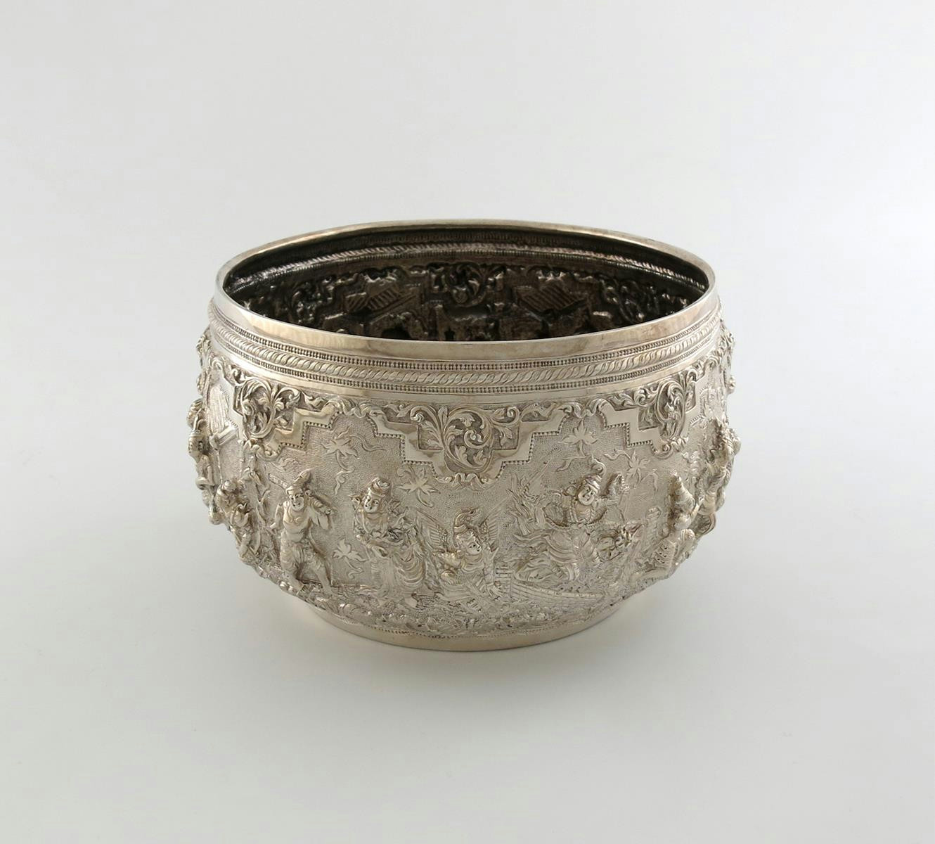 circular bellied form, heavily embossed with figural scenes on a matted background, chased foliate scroll borders, diameter 16.5cm, approx. weight 25oz.