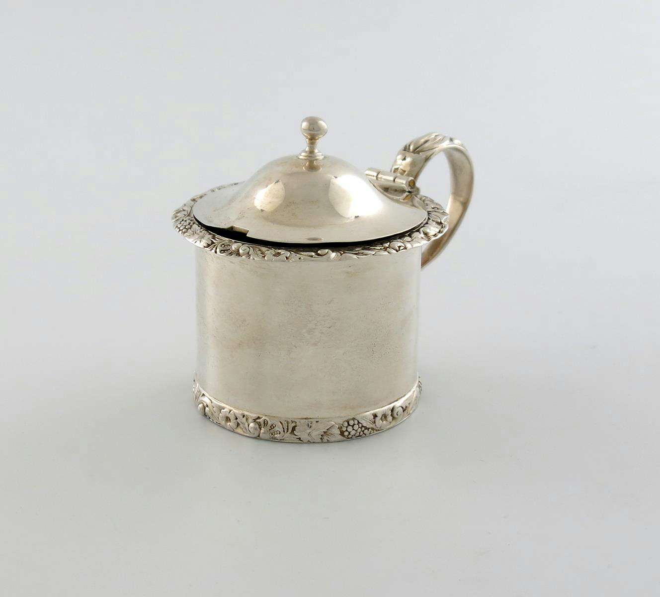circular form, leaf capped scroll handle, foliate scroll border, domed cover with a ball finial, blue glass liner, height 7.5cm, approx. weight 4oz.
