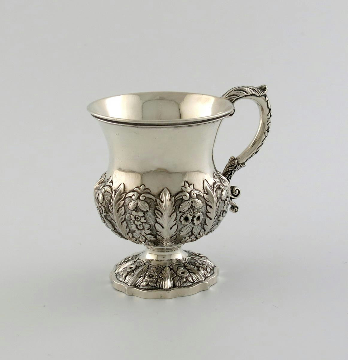campana form, embossed foliate decoration, leaf-capped scroll handle, on a raised foliate foot, height 9.6cm, approx. weight 5.5oz.