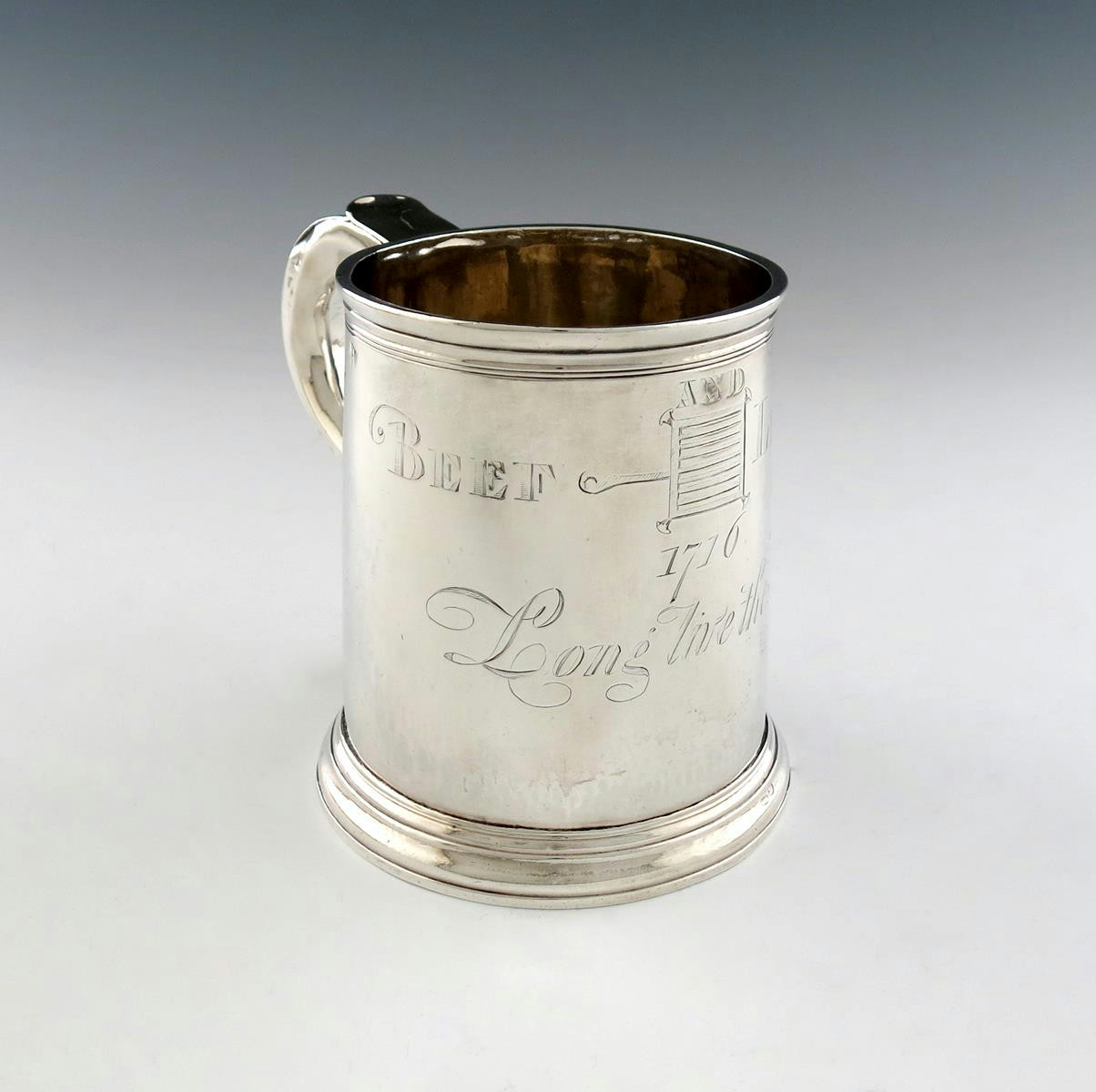 tapering circular form, the scroll handle with worn scratch initials '?R' and a later 'B', the front engraved with grid iron and inscribed 'Beef and Liberty 1716', 'Long Live the King', on a circular foot, height 12cm, approx. weight 14.5oz.