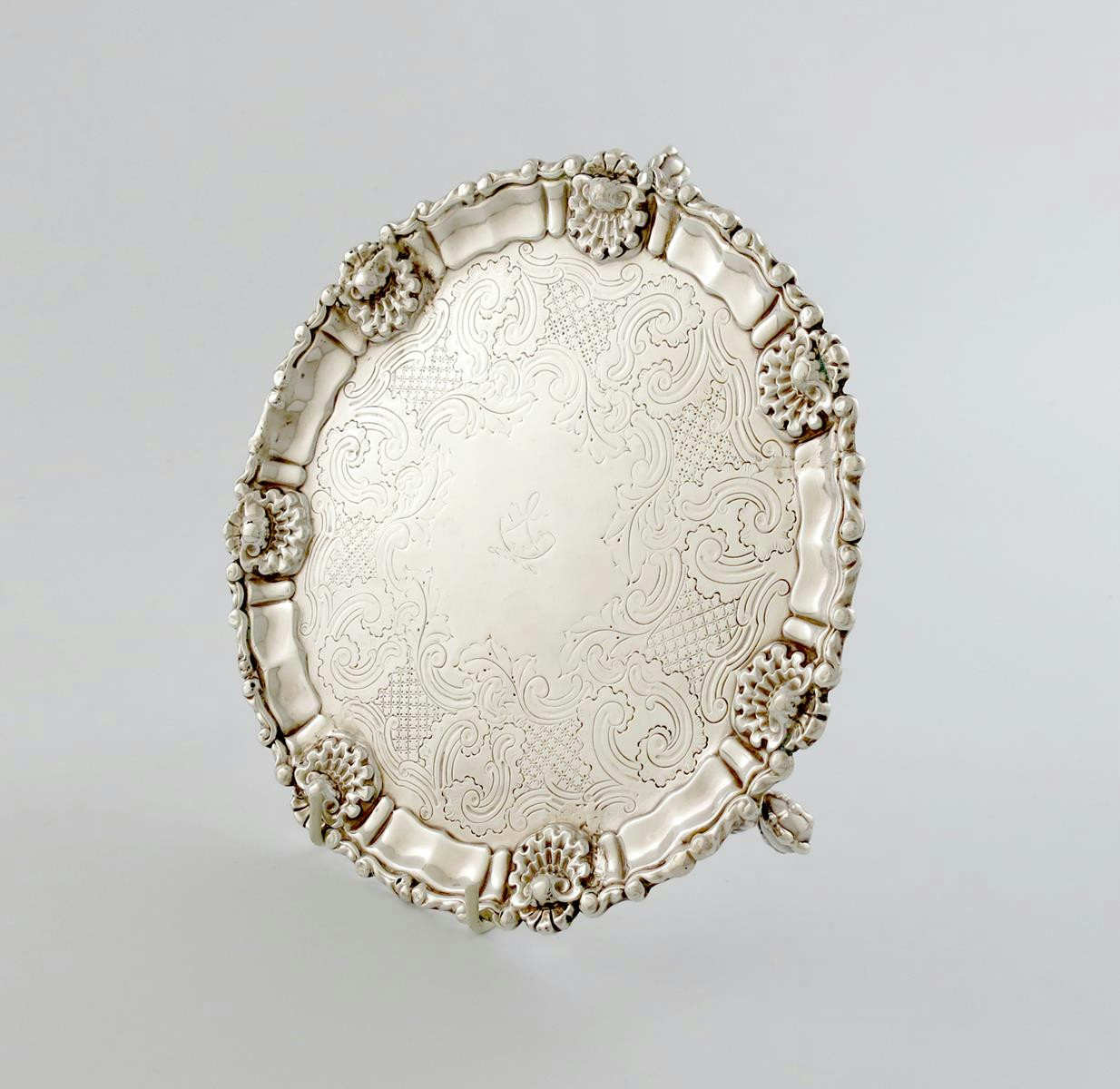 circular form, shell and scroll border, the centre with chased foliate scroll and lattice decoration, on three claw and ball feet, engraved with the Hornby crest, diameter 22cm, approx. weight 14oz.
