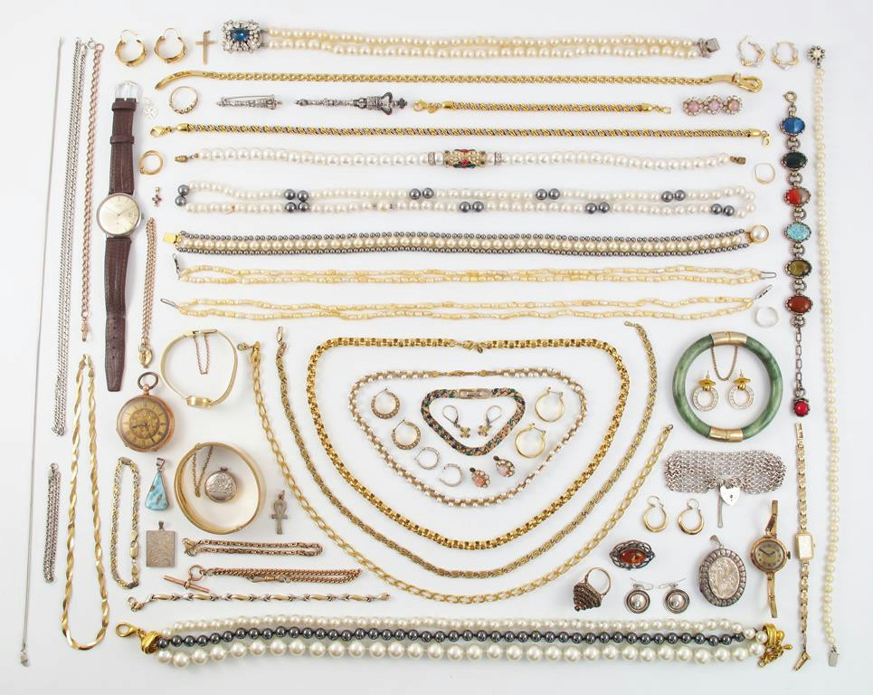 A large quantity of jewellery including three gold wristwatches, a 9ct gold bangle, a gentleman's wristwatch by Rotary and various gold necklaces, earrings, rings and other items of costume jewellery.