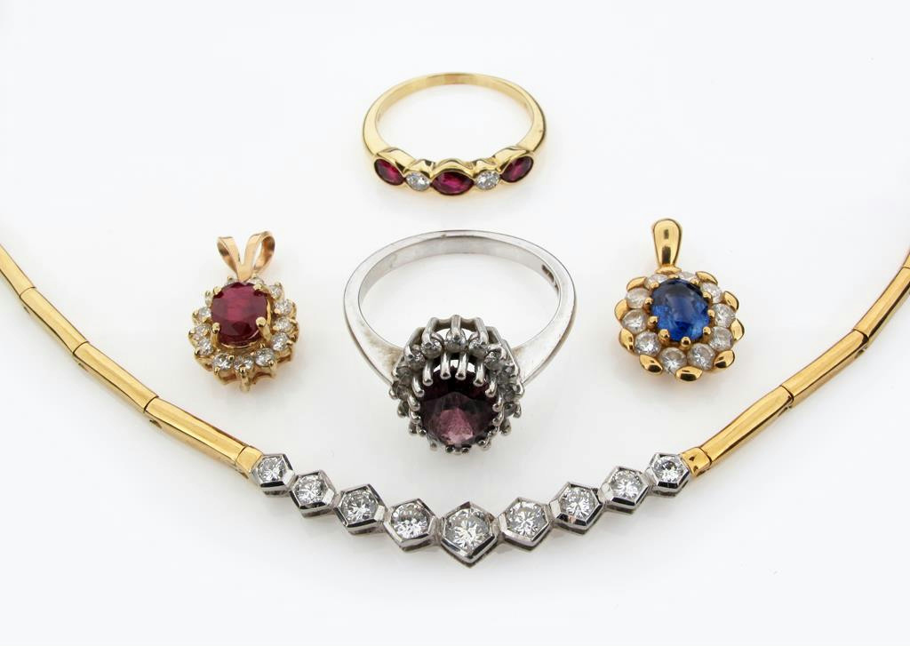 A yellow gold articulated necklace set with graduated circular cut diamonds, a ruby and diamond cluster pendant, a sapphire and diamond cluster pendant, a ruby and diamond five stone ring and a garnet and diamond cluster ring.