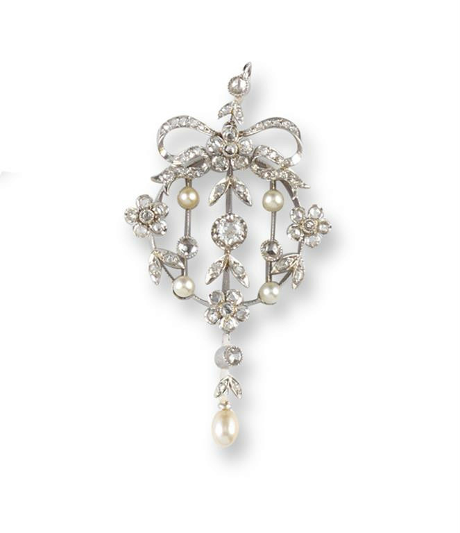 An Edwardian diamond and untested pearl set circular pendant, set overall with graduated old circular and rose cut diamonds and four pearls in platinum and white gold. 2.6cm wide.