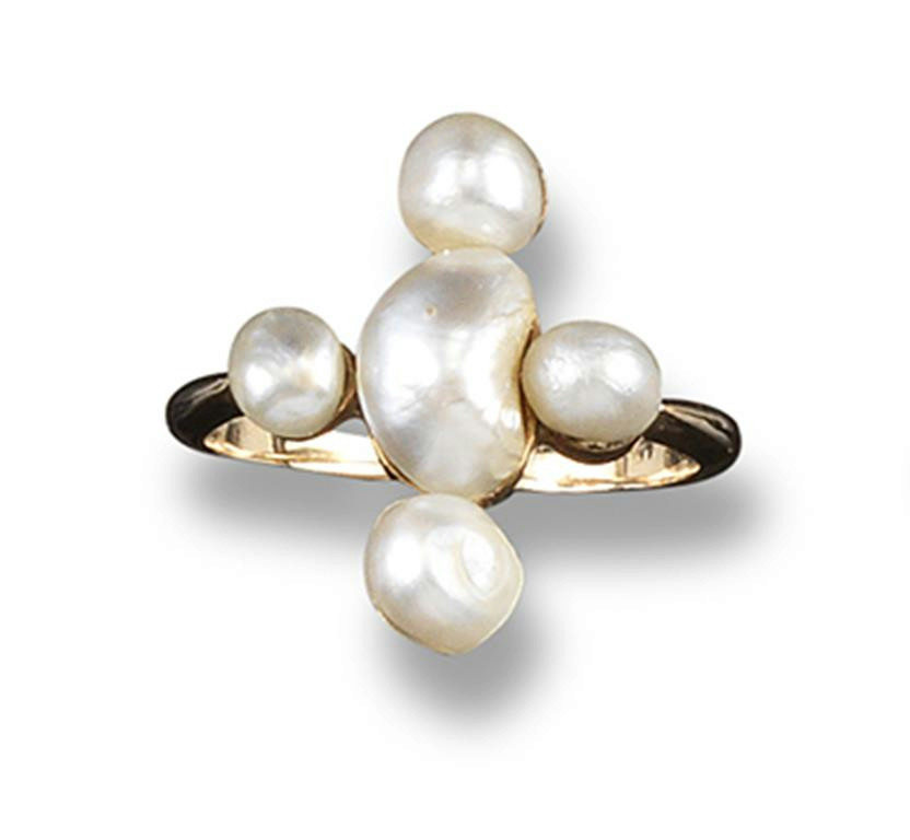 A natural pearl set gold ring, of cruciform design and set with five pearls in yellow gold.