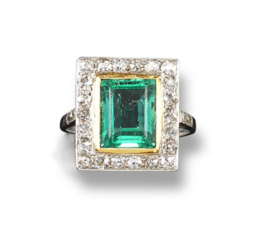 An emerald and diamond cluster ring