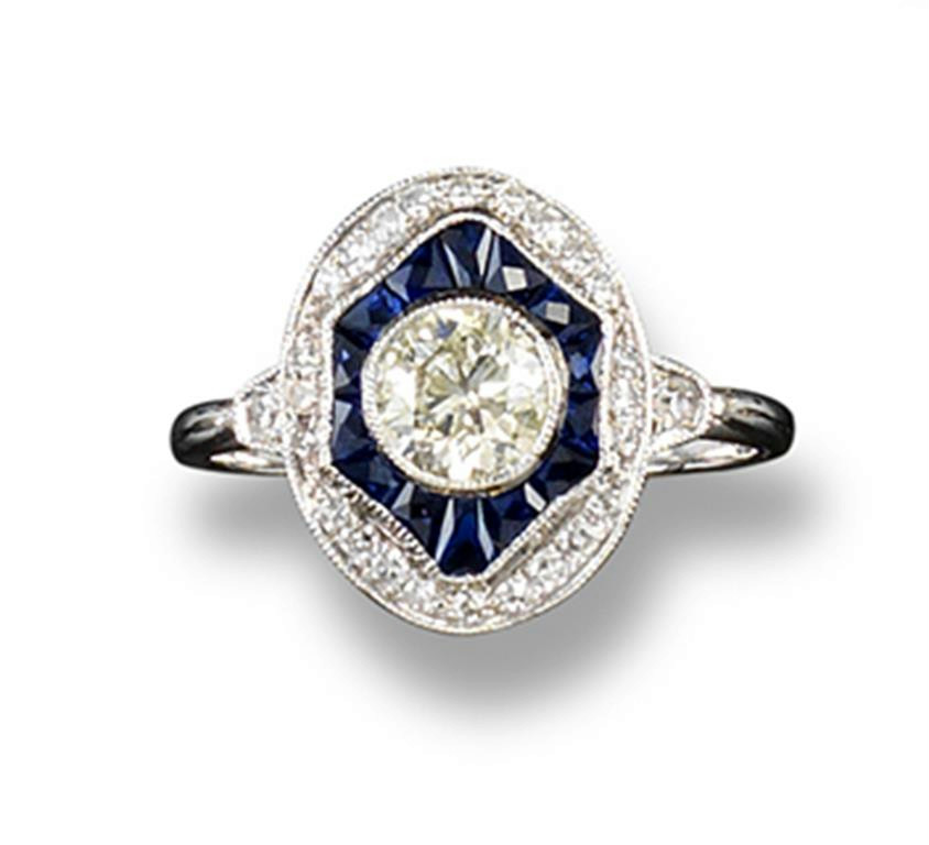 A sapphire and diamond set cluster ring, the old circular cut diamond is set within a surround of fancy cut sapphires and a further border of circular cut diamonds. White gold mount. Size O.