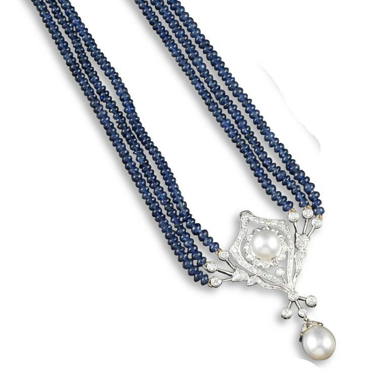 A cultured pearl and diamond pendant, set overall with graduated circular cut diamonds in white gold, and set with two cultured pearls. Suspended from a three row sapphire bead necklace. With diamond set white gold clasp. 46cm.