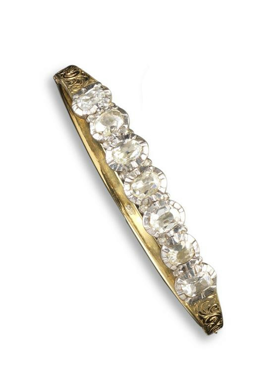 A diamond hinged bangle, mounted with seven oval shaped diamonds in closed back rub-over mounts. Set in silver and gold. 33g.