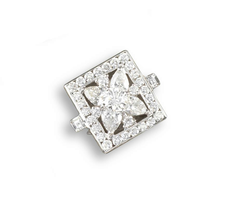 A diamond cluster ring, the centre round brilliant cut diamond is set within a surround of pear shaped diamonds and a border of smaller circular cut diamonds in white gold. Size H 1/2.