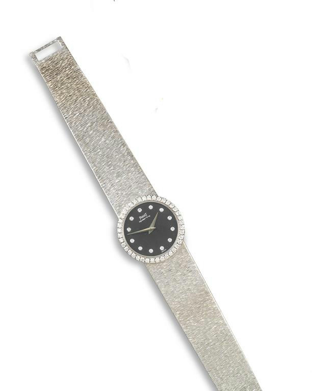 A ladies 18ct white gold backwinding wristwatch by Piaget, the signed circular plain black dial with diamond numerals, diamond set bezel, quartz movement, 18ct integrated white gold band. 16.5cm.