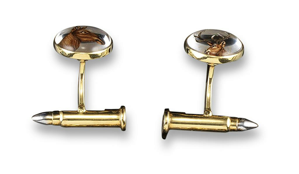 A pair of reverse carved crystal stalking cuff links, depicting a deer and stag on mother of pearl ground, with gold bullet terminals. Marked D&F, with modern Birmingham marks. Case by Hamilton & Inches.