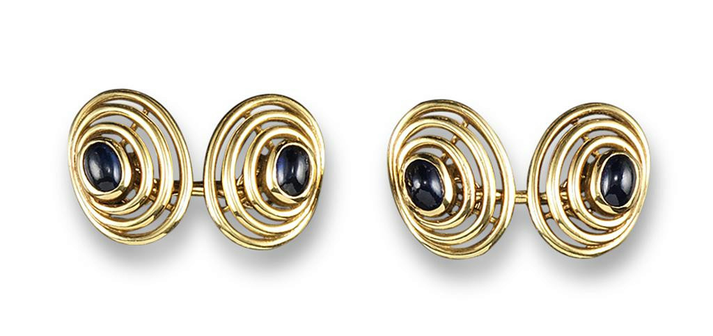 A pair of sapphire and gold cufflinks, the oval shaped cabochon sapphires are mounted in a surround of concentric ovals.