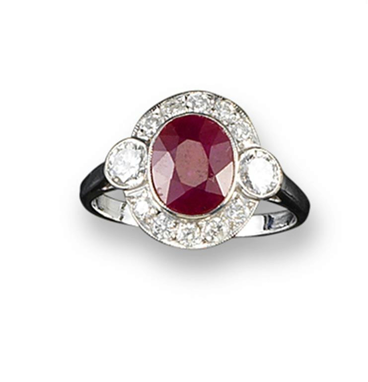 A ruby and diamond cluster ring, the oval shaped ruby weighs approximately 2.00cts and is set within two circular cut diamonds and a further surround of smaller circular cut diamonds in white gold. Size O.