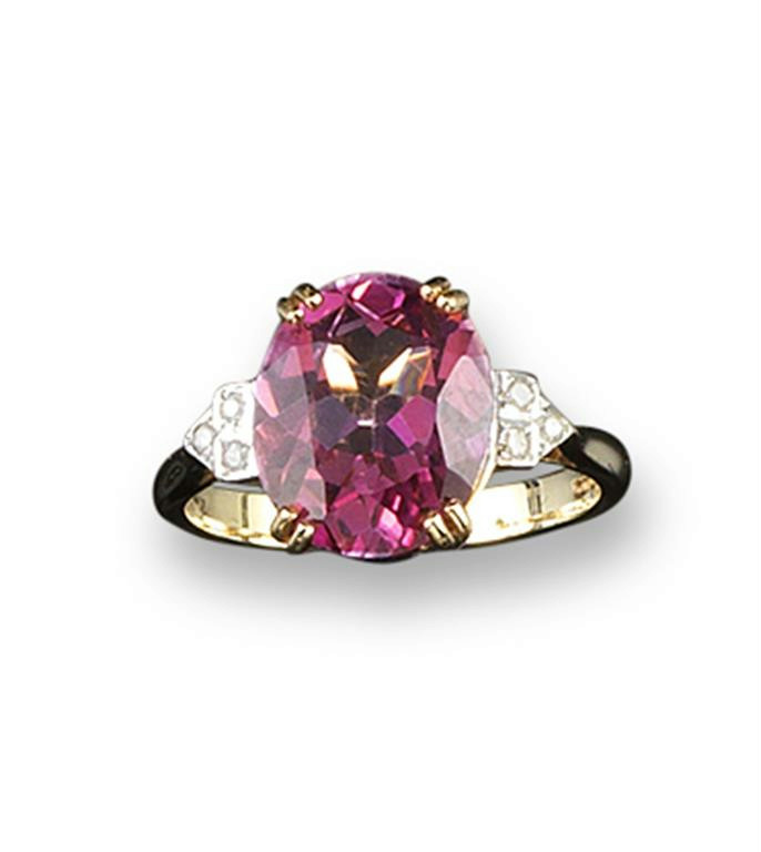 A pink tourmaline and diamond ring, the oval shaped pink tourmaline is set with three circular cut shoulder diamonds in yellow gold. Size O.