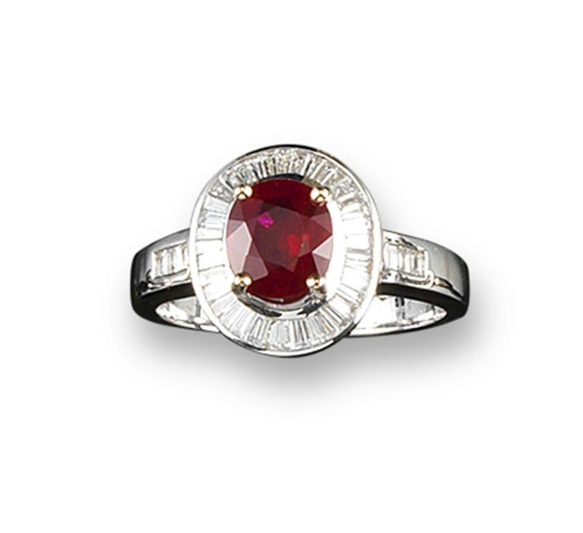A ruby and diamond cluster ring, the oval shaped ruby is set within a surround of tapered baguette shaped diamonds in white gold. Size O.