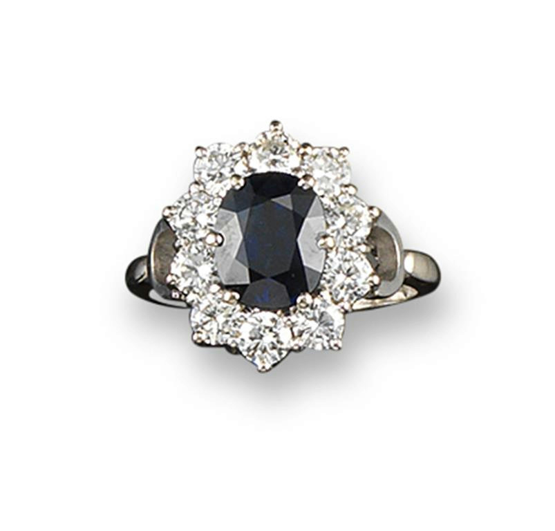 A sapphire and diamond cluster ring, the oval shaped sapphire is set within a surround of ten round brilliant cut diamonds in 18ct white gold. Size M.