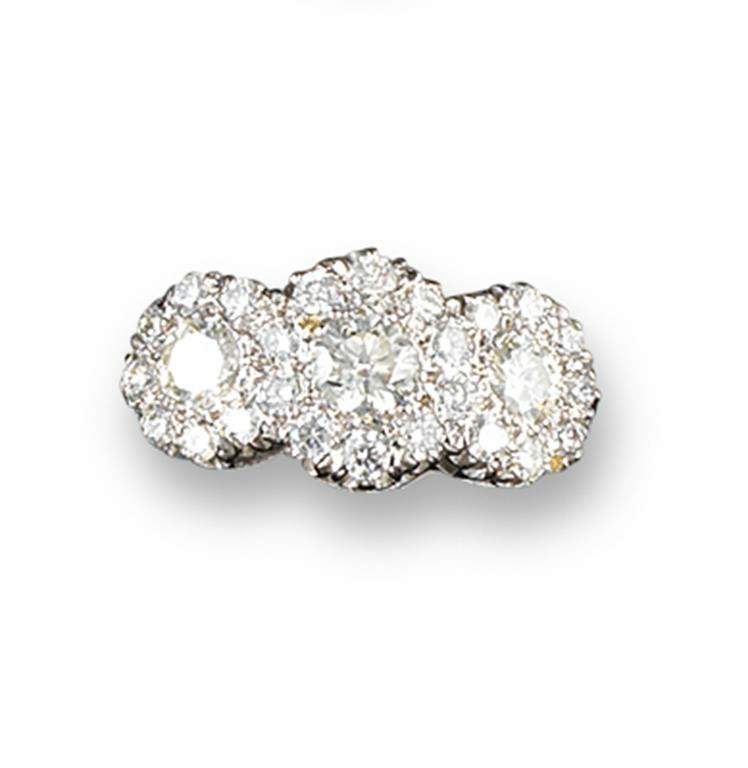 A diamond cluster ring, the three principle diamonds are set within surrounds of circular diamonds in white gold. Size O.