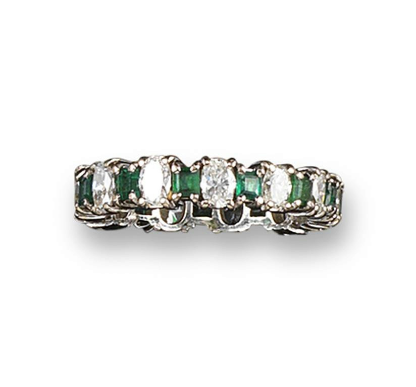 An emerald and diamond set full circular eternity ring, the oval shaped diamonds are alternately set with square cut emeralds in white gold. Size P.