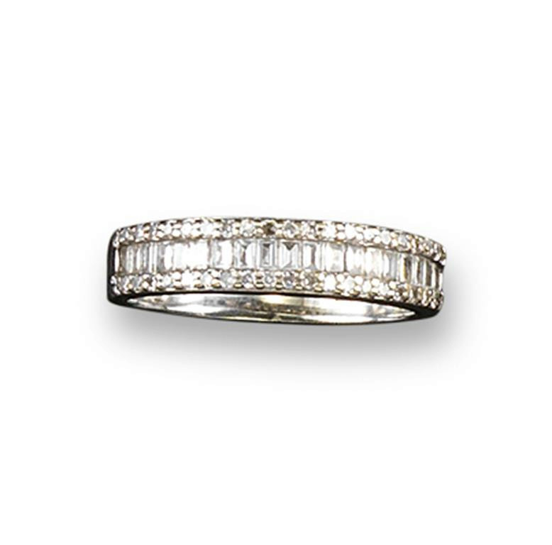 A diamond half hoop ring, the central line of baguette shaped diamonds set within two rows of circular cut diamonds in white gold. Size N.